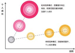 最后,轮岗是一种更为高效的人才培养方式,真正值得培养的人最终会因为轮岗而加速成长。图3揭示了轮岗培养模式是如何加速被培养对象成长的,图中圆圈的大小可以理解为能力的大小。由于轮岗能够使得被培养对象不断地接受更大的挑战、解决更复杂的问题,能够不断地在深度和广度拓展其视野,其能力的提升也会更快。